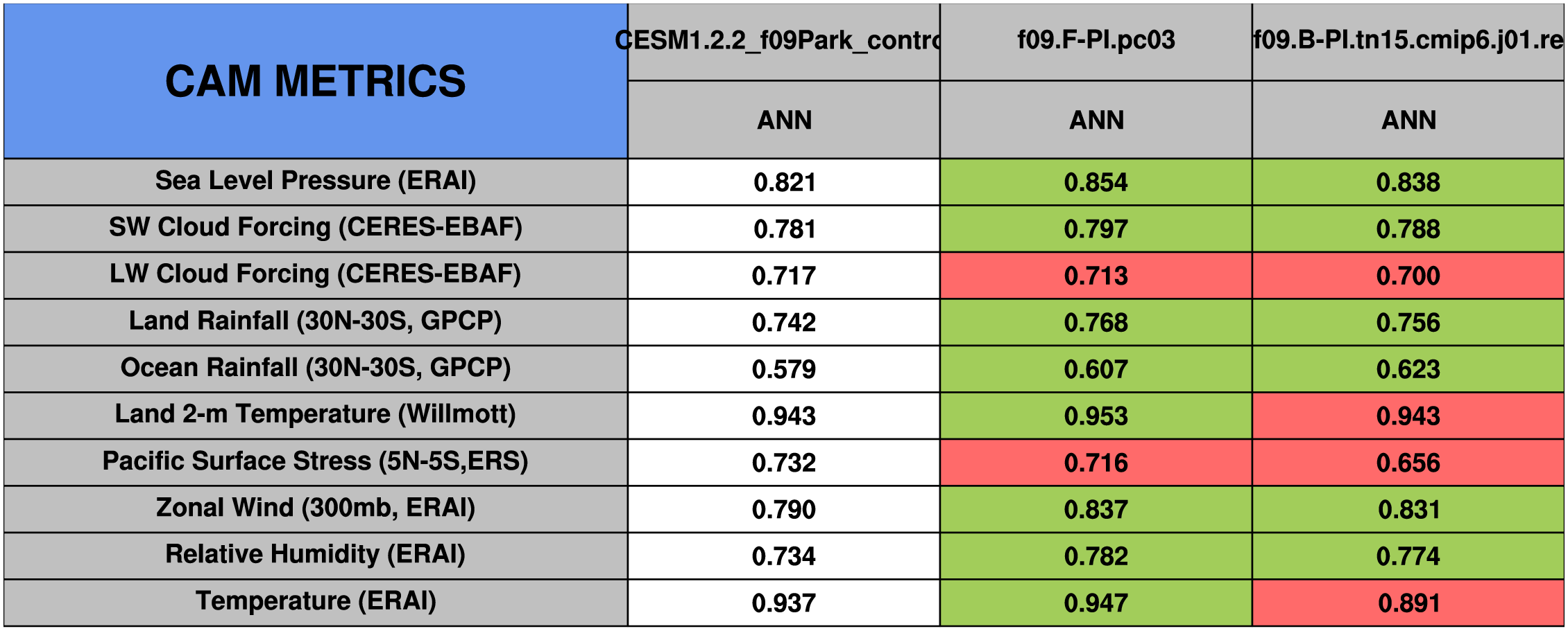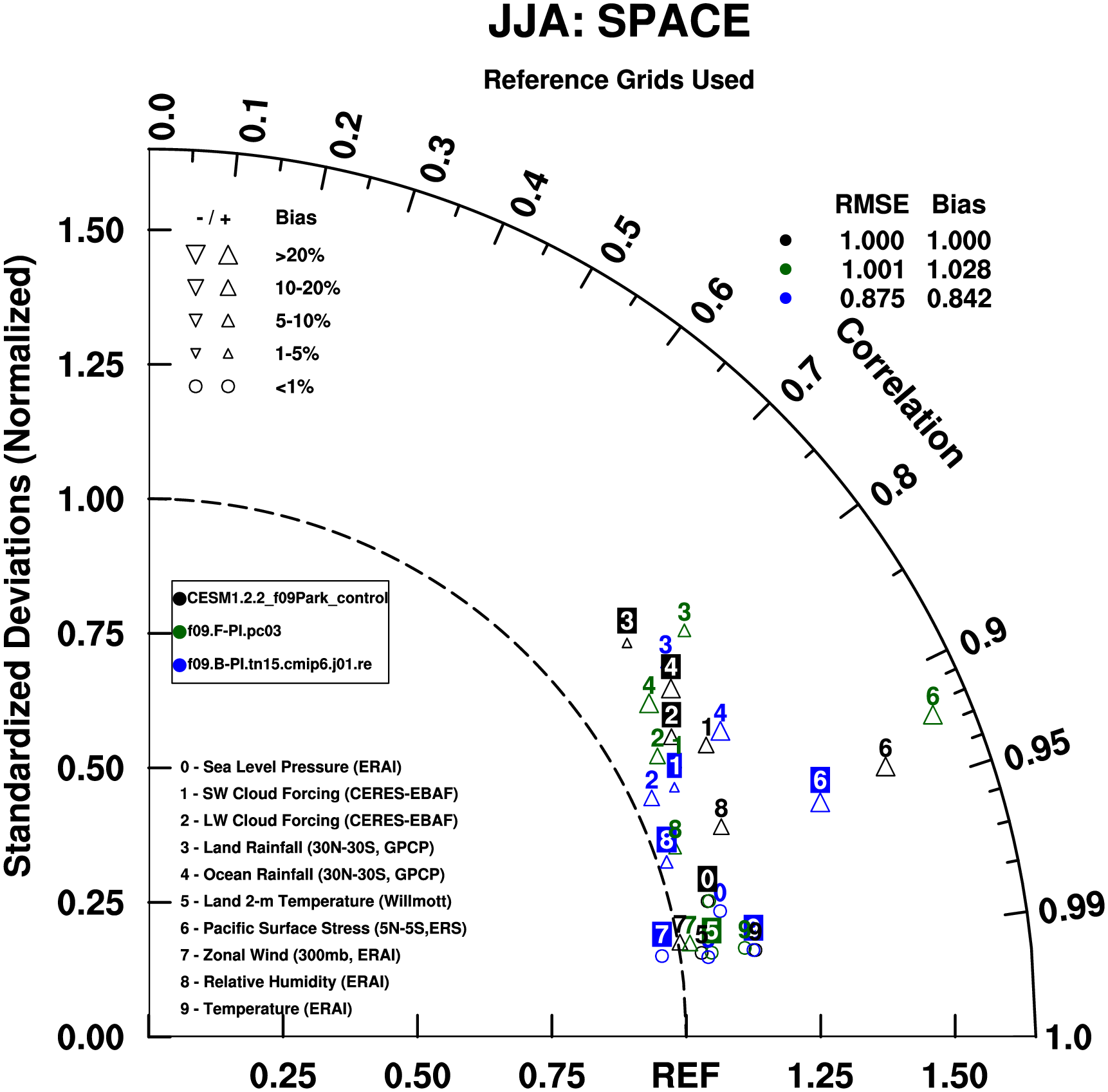 Taylor Diagrams were developed by Karl Taylor at PCMDI (paper|tech note) and aim to condense information about variance and RMSE characteristics of a particular model run when compared with observations in a single diagram. The tables summarize the individual metrics for each variable considered including:
