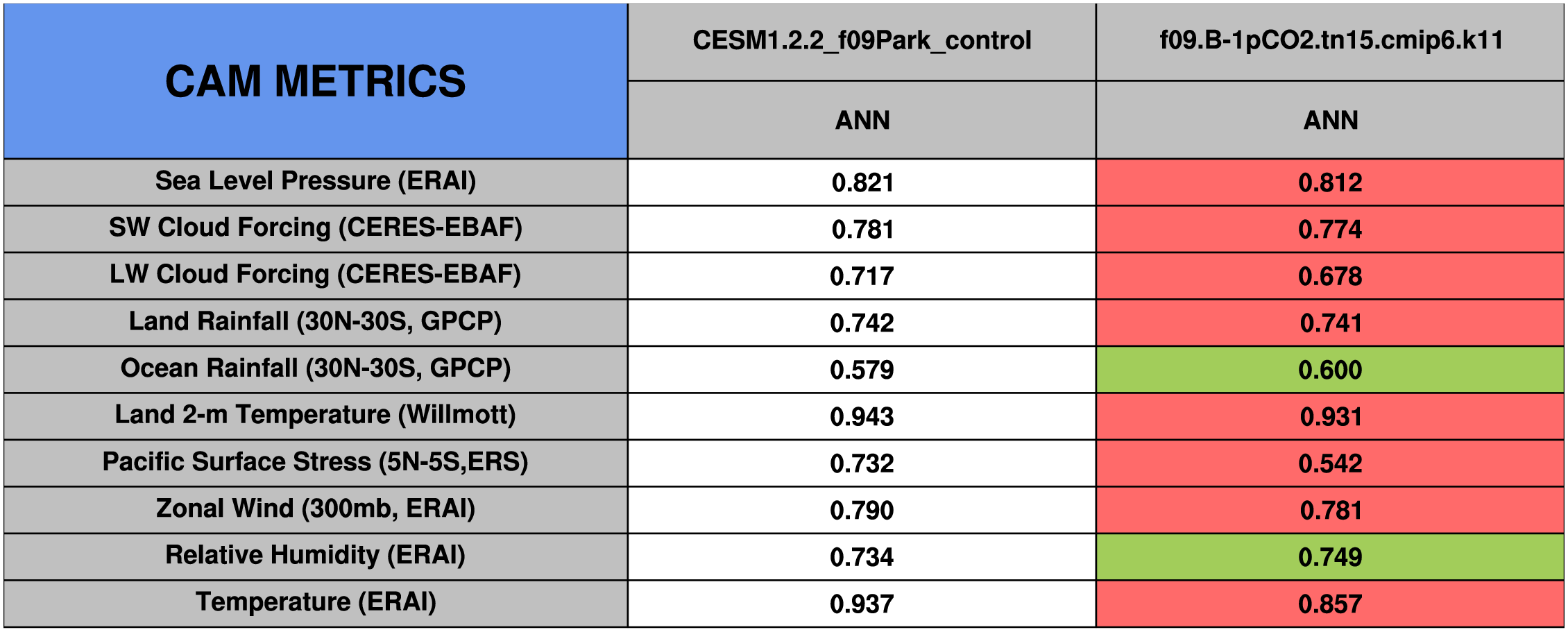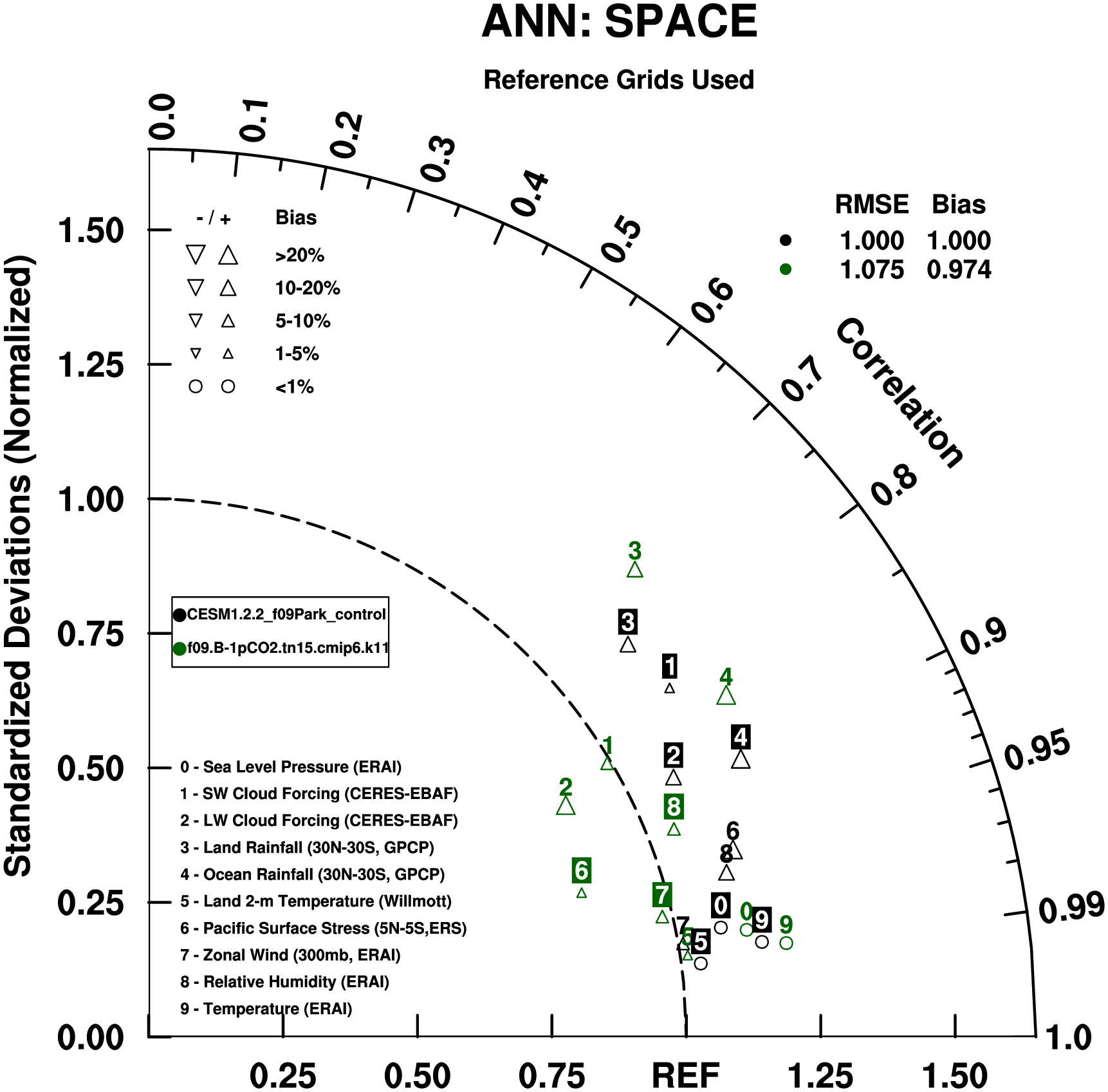 Taylor Diagrams were developed by Karl Taylor at PCMDI (paper|tech note) and aim to condense information about variance and RMSE characteristics of a particular model run when compared with observations in a single diagram. The tables summarize the individual metrics for each variable considered including: