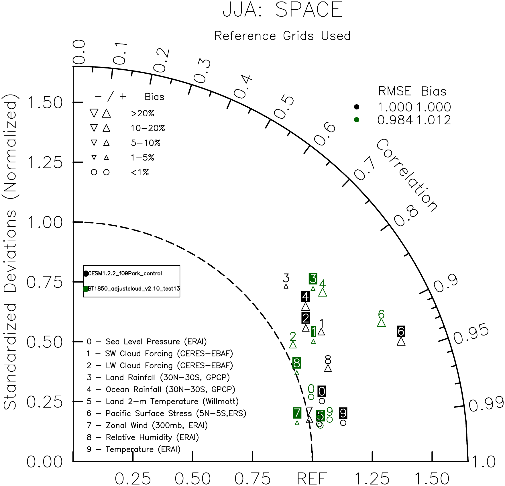 Taylor Diagrams were developed by Karl Taylor at PCMDI (paper|tech note) and aim to condense information about variance and RMSE characteristics of a particular model run when compared with observations in a single diagram. The tables summarize the individual metrics for each variable considered including: