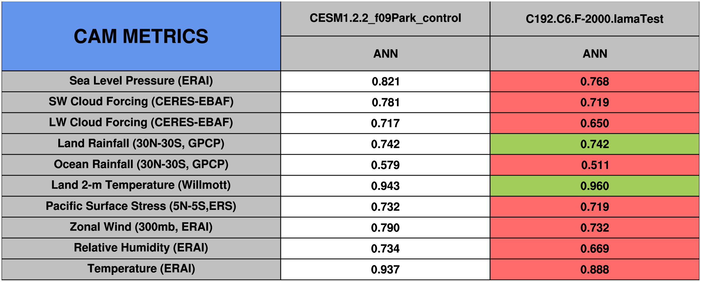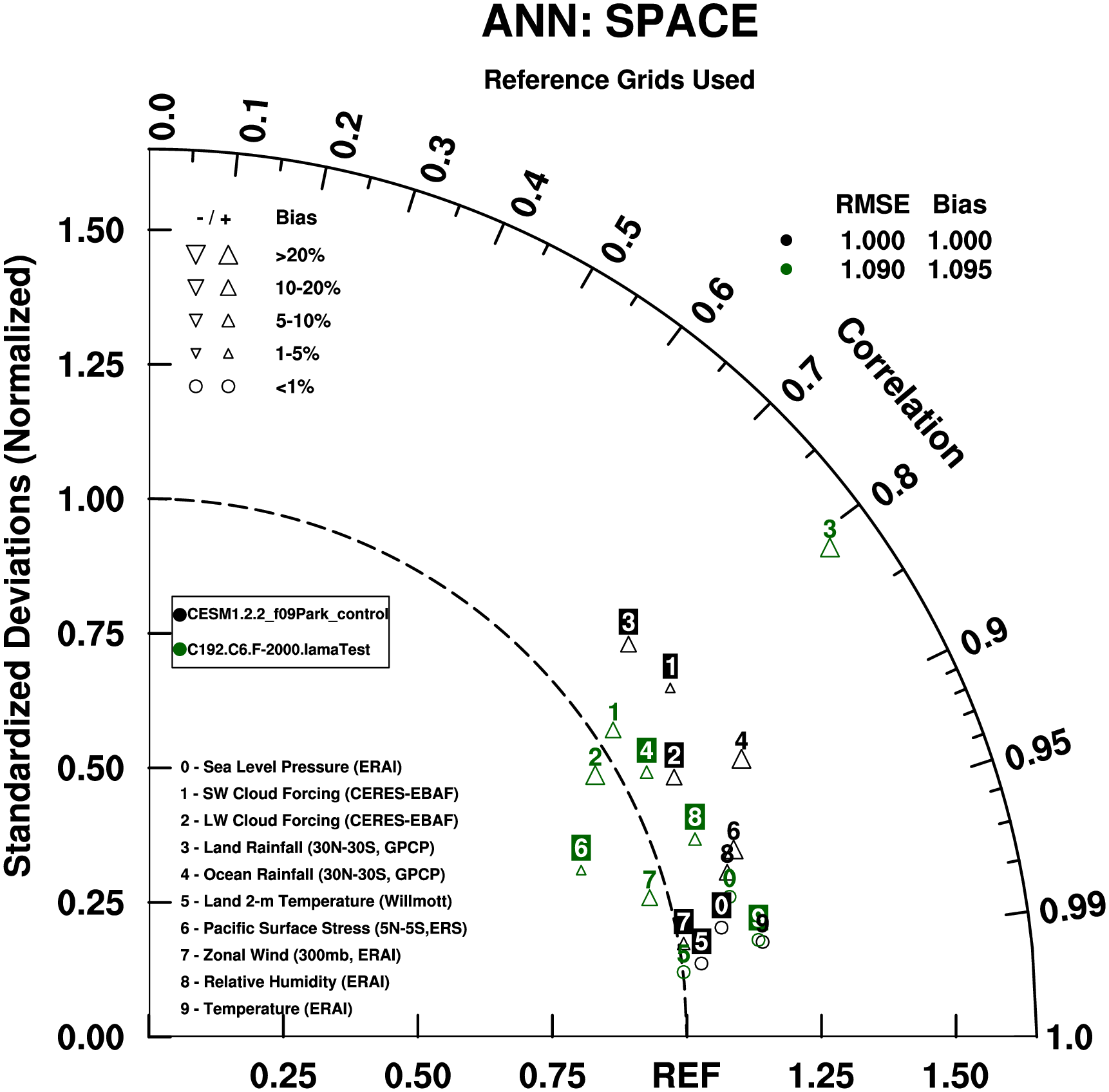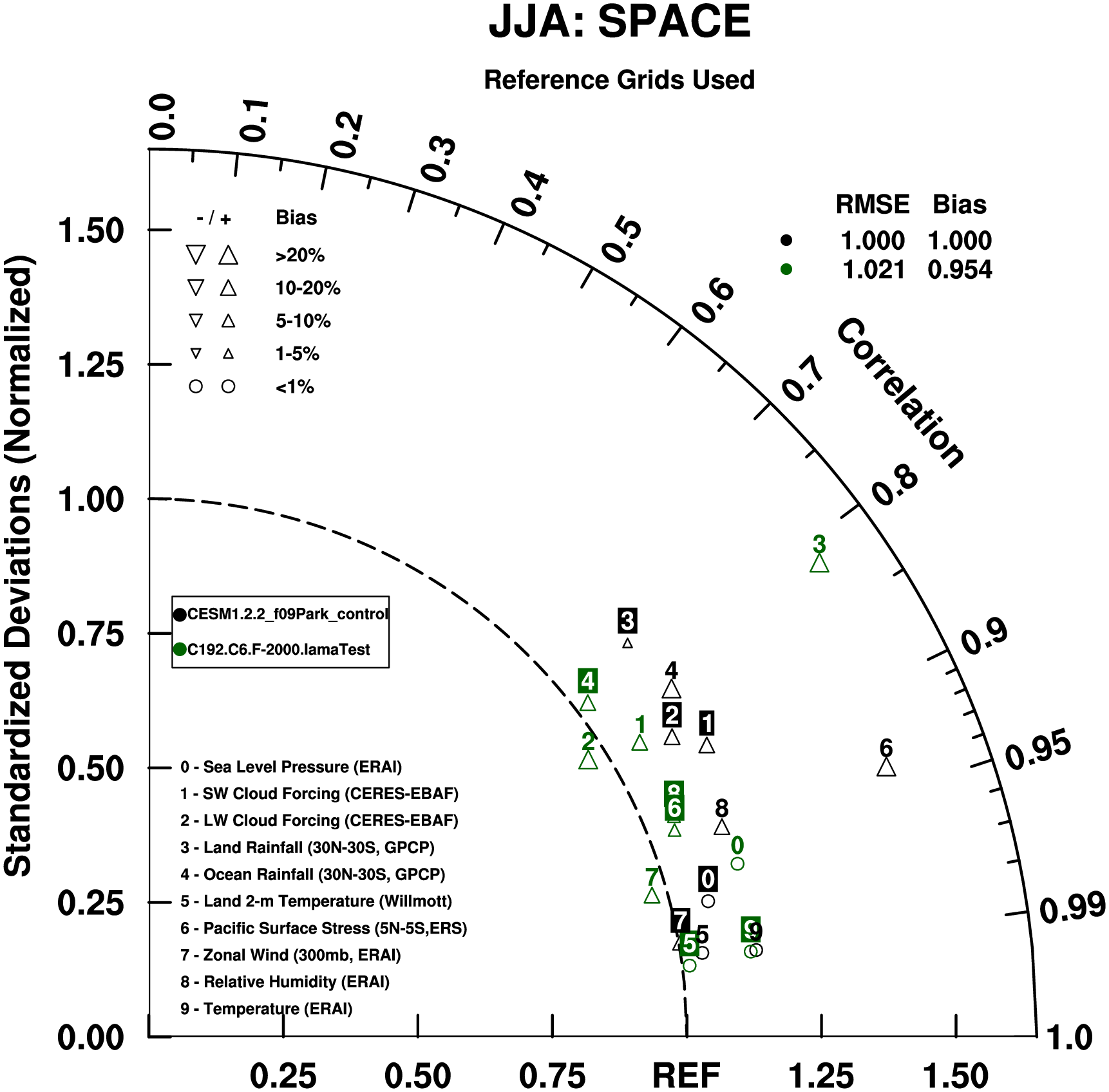 Taylor Diagrams were developed by Karl Taylor at PCMDI (paper|tech note) and aim to condense information about variance and RMSE characteristics of a particular model run when compared with observations in a single diagram. The tables summarize the individual metrics for each variable considered including: